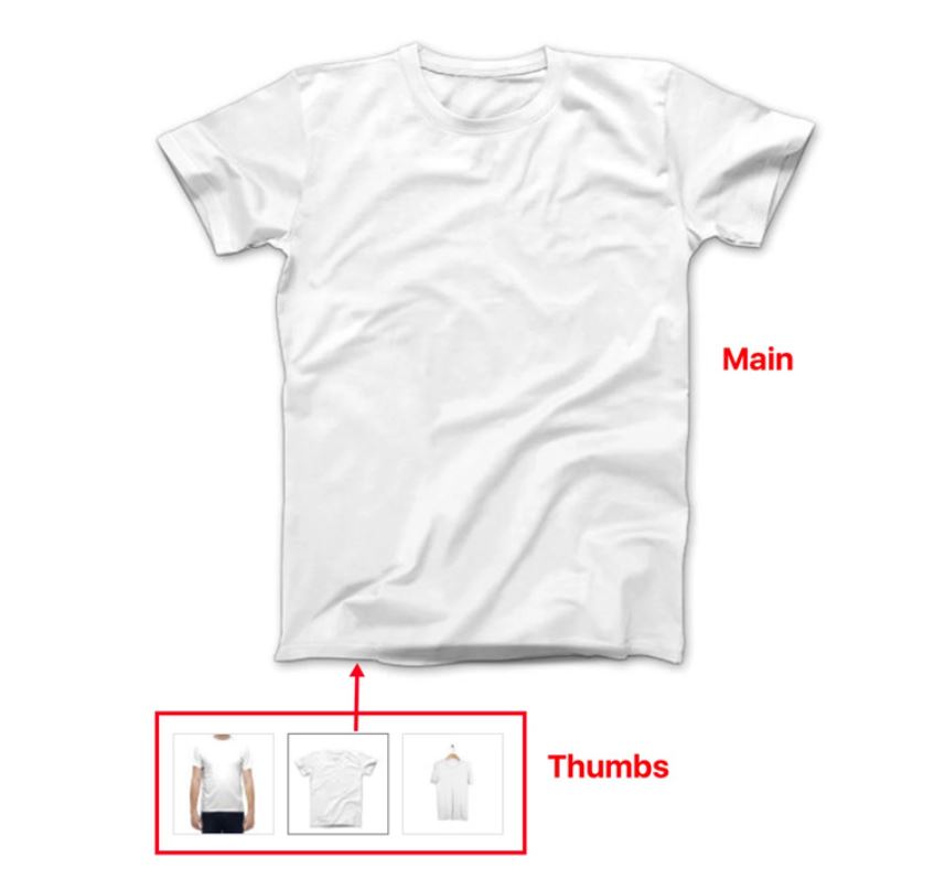 Above are two arrangements of pictures: primary and thumbs (short for thumbnails). The primary picture is for customers; the thumbs, for connections. Clearly, the chose thumb is equivalent to the primary picture, and you can convey them in both of these two most familiar ways.